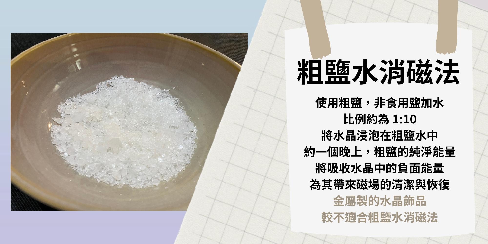 ⚠️ 注意事項: 帶有金屬製(例如銀飾)的水晶飾品較不適合此消磁法,粗鹽水易讓金屬變質氧化。